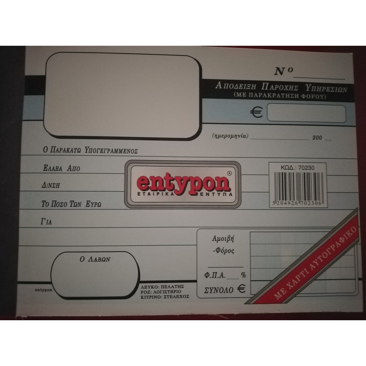 ΑΠΟΔΕΙΞΗ ΠΑΡΟΧΗΣ ΥΠΗΡΕΣΙΩΝ ΧΩΡΙΣ ΦΠΑ ΜΕ ΠΑΡΑΚΡΑΤΗΣΗ ΦΟΡΟΥ 15×21εκ. 50×3φ.